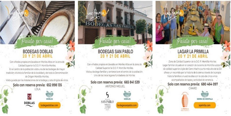 La Asociación Vino en Rama propone «Pásate por Casa», una actividad que cuenta con 4 bodegas en Montilla / Sierra de Montilla y 4 bodegas en Moriles / Moriles Altos en la que el interesado puede conocer los propios lugares donde nacen los vinos de Montilla-Moriles