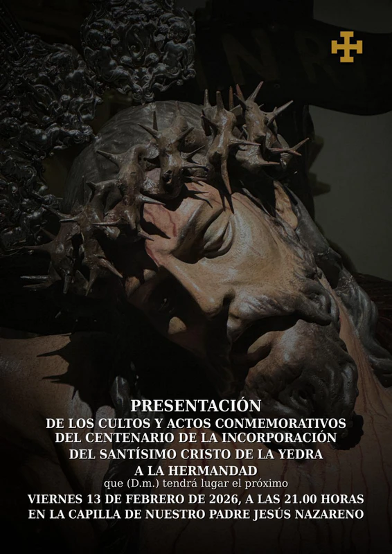En la Capilla de Ntro. Padre Jesús Nazareno (entrada por el patio) se va a realizar la presentación de los cultos, cartel y actos conmemorativos con motivo del CENTENARIO de la llegada del Santísimo Cristo de la Yedra a la Hermandad de Nuestro Padre Jesús Nazareno y María Santísima de los Dolores.