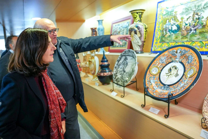La titular andaluza ha visitado en La Rambla el Ayuntamiento de la localidad, donde ha firmado en el libro de honor; para después desplazarse al taller del artesano y al Museo de la Cerámica, acompañada por el alcalde, Jorge Jiménez Aguilar, y representantes de la Asociación de Artesanos de La Rambla.