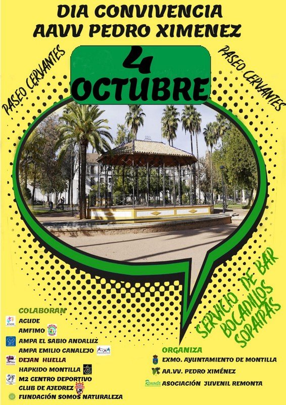 social favorite_border iCal Export Google Calendar Outlook 365 Outlook Live 04 Oct 11:00 AM Until 05 Oct, 02:00 AM 15h Jornada de convivencia vecinal de la AVV Pedro Ximénez Paseo de Cervantes Details Map Weather Other Events Paseo de Cervantes No address found No data found. Organizado por AVV Pedro Ximénez Intenso día de convivencia … Sigue leyendo Jornada de convivencia vecinal de la AVV Pedro Ximénez