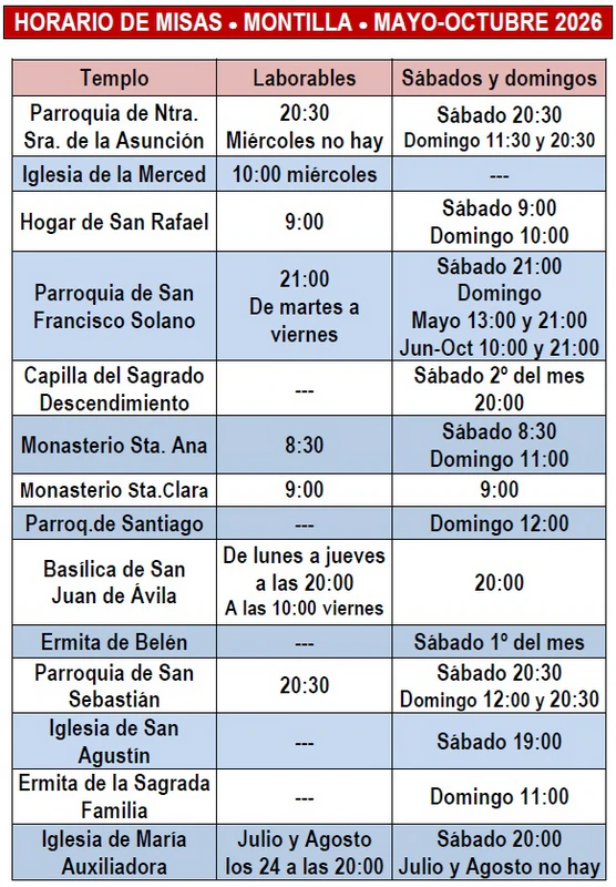 Aquí os dejamos el horario de misas de las diferentes Iglesias y Parroquias de Montilla