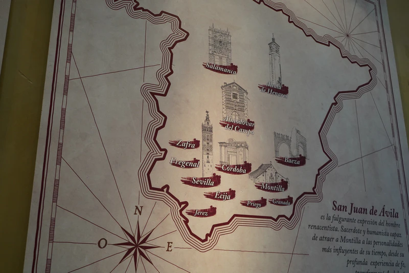 La exposición, comisariada por Antonio Luis Jiménez Barranco, se estructura como una introducción a la figura del santo y a la Ruta Vitis Dei, con paneles que recorren su cronología vital, los principales hitos de su trayectoria, su dimensión como humanista del Renacimiento y sus múltiples facetas, desde la literaria y asistencial hasta su compromiso social y su defensa de la mujer. La muestra concluye con un espacio dedicado a Montilla como “tierra acogedora” y a los principales enclaves avilistas de la ciudad.