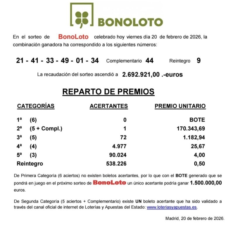Que bien va a empezar el fin de semana para el agraciado con el segundo premio de la Bonoloto de ayer viernes que se llevará rimer premio de la Lotería Nacional del decimo 83552 que ha caído en Montilla