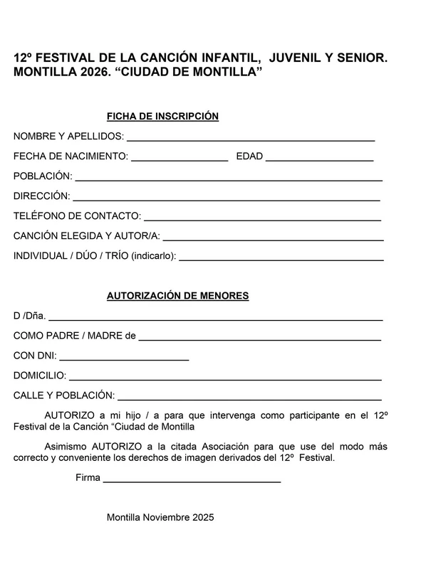 Los participantes deberán realizar la correspondiente solicitud de inscripción y acompañarla del video en directo sin editar, tan solo con la base instrumental elegida de fondo, sin olvidar un número de teléfono para contacto y dirección de correo electrónico, antes del 1 de FEBRERO del 2026 a las 24:00 H, al correo de la asociación: poprockmontillano@gmail.com o al número de WhatsApp 626153843 (David Hidalgo).